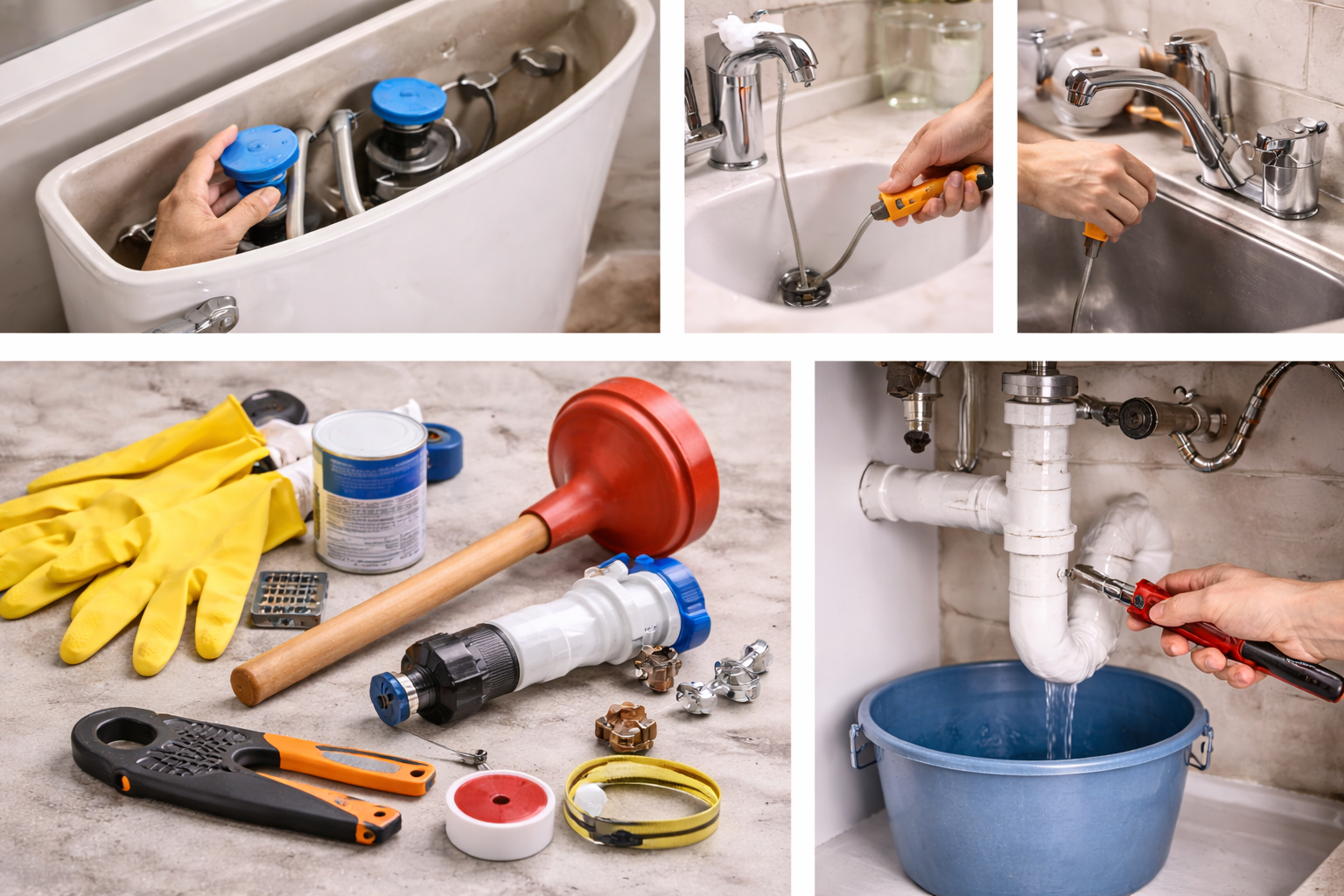Most DIY repairs need a plunger, adjustable wrench, bucket, flashlight, and a drain snake. See our essential tools guide for details.